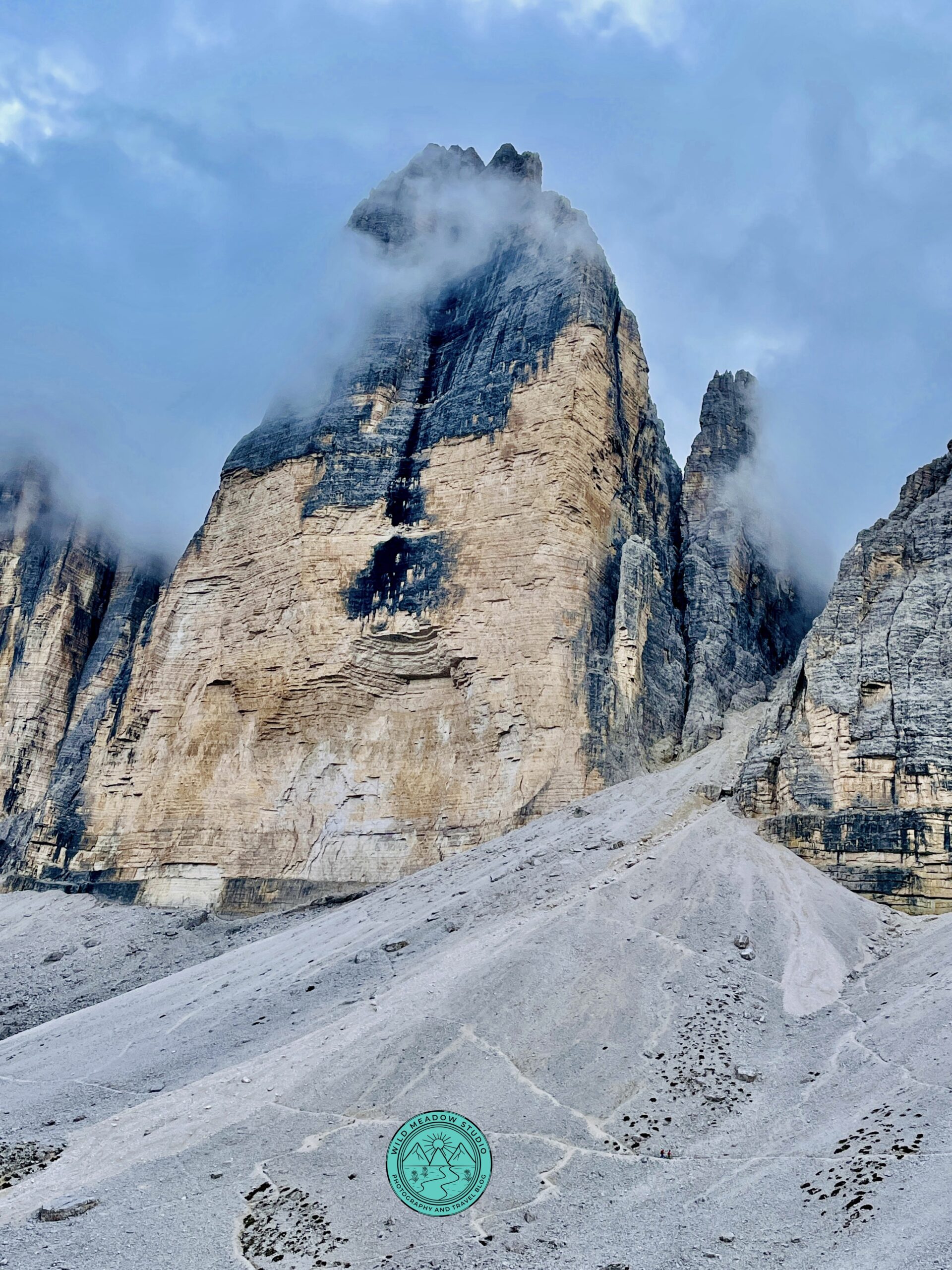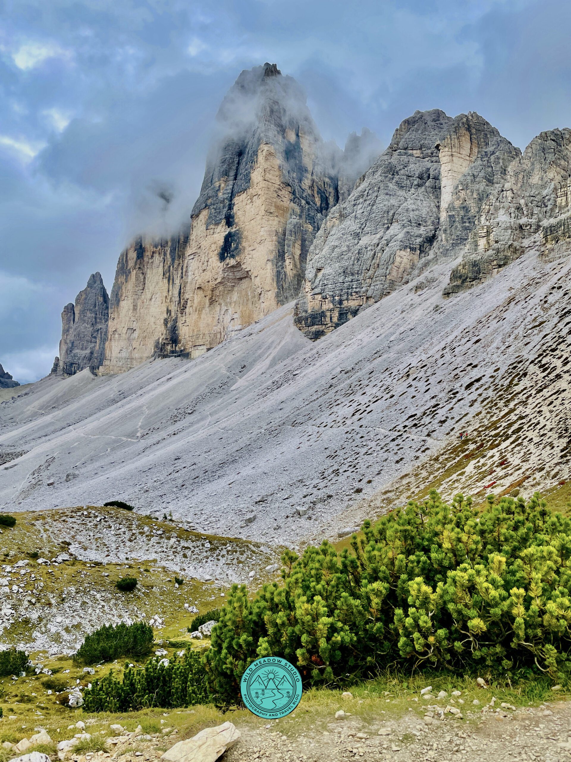 While the trail isn’t technically difficult, the altitude and length add a moderate challenge. There is a section where you climb down into a valley and then climb back up on the other side, making it a little more challenging, but along the way, you will pass the mountain *Rifugio’s where you can stop for food, rest or simply to soak in the views. Every section of this hike feels iconic. We went mid-September, early morning and had no problems, wasn’t busy at all, it was a little cloudy that day, which may have deterred some people, but this was our only day to do this hike, so we went for it and were happy we did. It was foggy to start, which was very cool, there were cute cows with the big bells around their necks, and at points the bell got pretty loud, which added to the atmosphere. Once you get around closer to the 3rdRifugio you’ll get that popular shot of the 3 peaks, but really, it’s beautiful the whole way around.