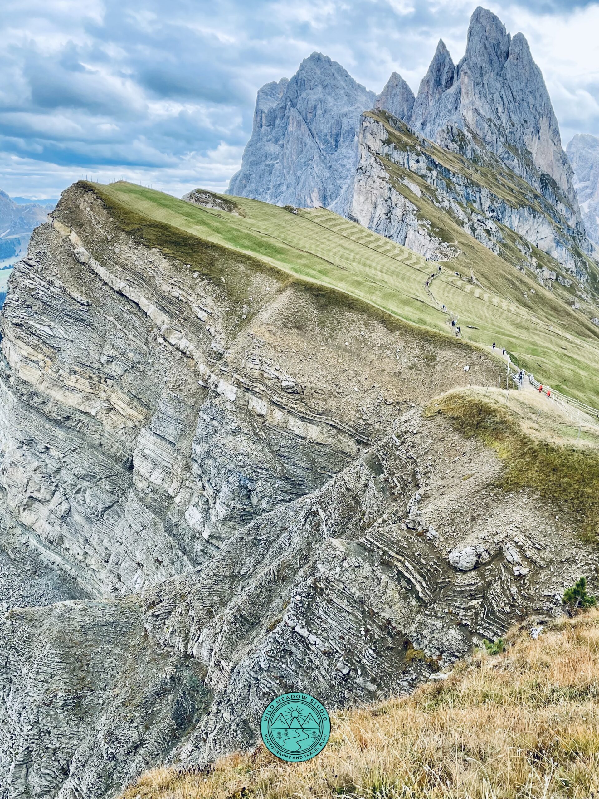 The Seceda ridgeline offers one of the most dramatic viewpoints in the Dolomites, with steep grassy slopes dropping into the valley below and jagged Odle peaks in the distance.