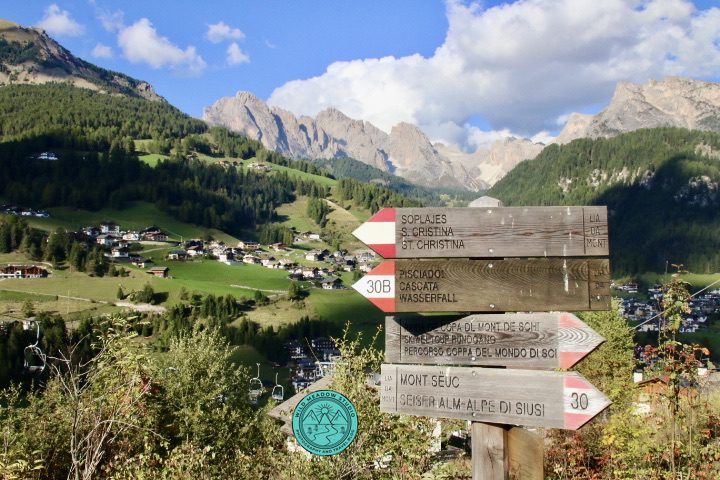 This is a moderate to easy hike due to the decent, while at the top of the cable car station you get amazing views of the dramatic Sassolungo peak, there are restaurants at this level, so you could enjoy a snack or lunch before your short hike, there is also another cable car that gets you closer to the peak if you desire and have the time. The hike itself is partially through the woods, has great views over Santa Cristina below and of the pretty Cascata Tervela Waterfall. Follow the signs for the 30B hike towards Santa Cristine and the Cascata (waterfall).