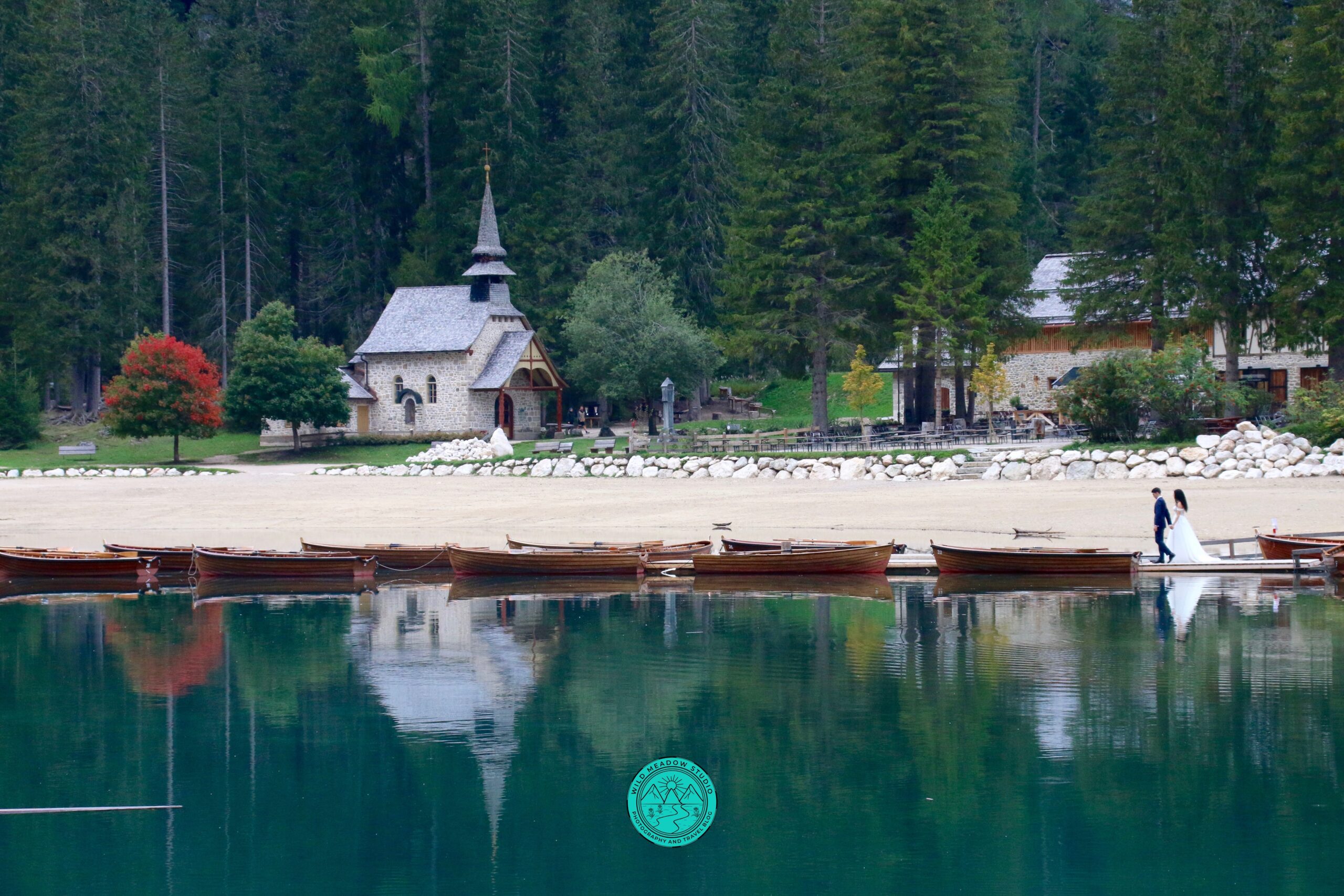 Lago di Braies is one of the most photographed lakes in the Dolomites. The mainly flat loop trail circles the turquoise lake, with reflections of steep mountain walls in the water. As well, there is a photogenic boat house with row boats, attached by a rope out in the lake, so if you get there early, and nobody is in them, you can get some great photos. There is also a pretty church on the west side of the lake, (on the right if coming from the parking lot).