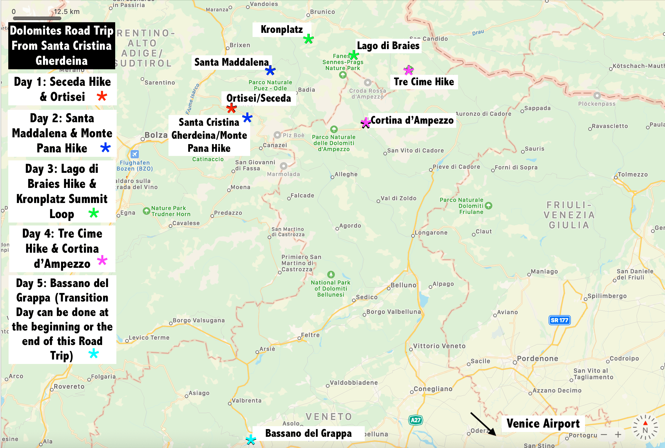 This map is just meant to give you an overview of where you’ll be going during this 5-day Road Trip Itinerary. We’ve grouped some places together that were in the same area or made sense to do in the same day, some are longer days than others, but all worked well for us, and we really enjoyed each day, hopefully you will too. For more information on these hikes, checkout our post “5 Great Hikes in the Dolomites with Incredible Views (east to moderate)”. For more information on these Towns, checkout our post “5 Incredible Mountain Towns to Discover in the Italian Dolomites, (including 1 Hidden Gem Nearby)”.