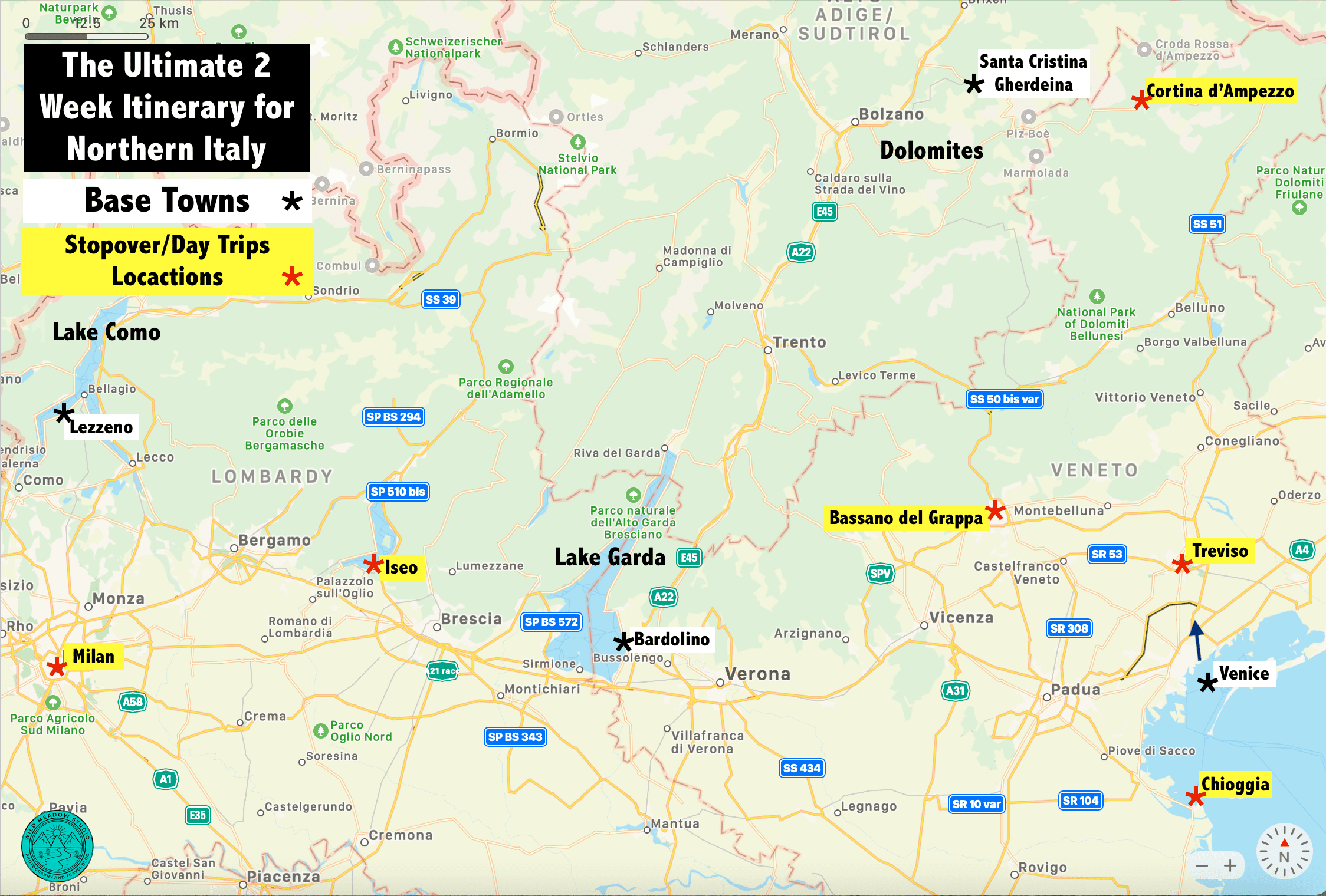This 16-night itinerary is planned to start and end in Venice, this journey takes you through the dramatic peaks of the Dolomites, the relaxed beauty of Lake Garda, the romance of Lake Como, the history of Milan, plus a couple stopover towns before returning to Venice for a slower city experience. A car is required for this trip, but we’ve planned this itinerary to minimize the driving distance for travel days, so they aren’t too long. The longest travel day is Lezzeno to the Venice Airport, which is approx. 3hrs and 45mins, which includes the small detour to Iseo, the rest are about 2 to 3 hours, so all very doable, especially with interesting places to stop and explore. For our Milan daytrip, we drove into Como and took the train into Milan, as we didn’t feel 100% comfortable driving in a big city with all the different parking restrictions, so this was an easy and less stress option. Also, we dropped off the rental car at the Venice airport before our stay in Venice, as we obviously didn’t need a car while there.